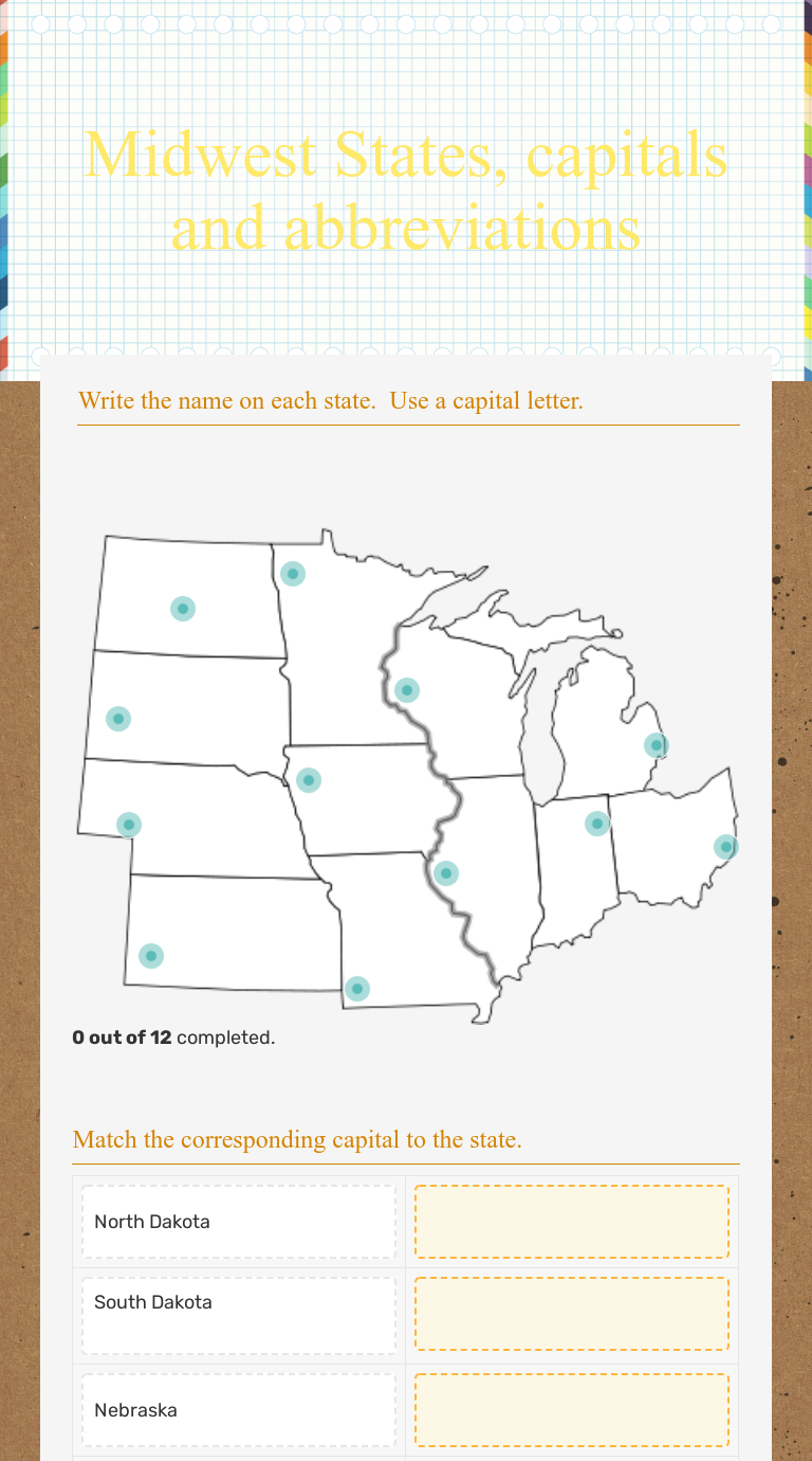 Midwest states worksheet. Missouri Compromise 7th and 8th grade - Teachers (U.S. National Park ... Give students approximately 7 minutes to write down on their cards (backside) 5 things their composite character cares or is concerned about as it relates to the Missouri Compromise. 3. On a blank sheet of paper sketch out your classroom arrangement. Label where students sit. 4. Midwest States & Capitals! Quiz - PurposeGames The Western States 11p Image Quiz Latest Activities No actions to report right now. About this Quiz This is an online quiz called Midwest States & Capitals! There is a printable worksheet available for download here so you can take the quiz with pen and paper. 0 0 The U.S. Midwest States And Capitals Quiz - ProProfs Quiz The Midwest comprises twelve states, and they are popularly known as America's Breadbasket. This area is known mostly for growing wheat. Just how much do you know about the Midwest states and their capitals from our discussions this week? Take up the test below and get to test your understanding and refresh your memory. All the best! FREE Printable 50 United States Coloring Pages for Kids Each of the free printable, 50 states coloring pages includes a state map, state flags, state flower, state bird, state landmark, and more. Use the united states coloring page with preschool, pre-k, kindergarten, first grade, 2nd grade, 3rd grade, and 4th graders. Simply print 50 states coloring pages pdf and you are ready to play and learn ...