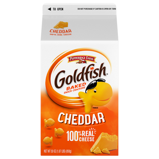 PDF Cheddar Goldfish® Made With Whole Grain 18105 300/0 Goldfish are the #1 cracker brand in households with kids; Cheddar Goldfish Made with Whole Grain are the #4 Goldfish retail variety, ideal for families seeking more whole grains. These 100 Calories pack sizes offer 0.75 oz single serve portions for school lunches, snacks or breakfast use.