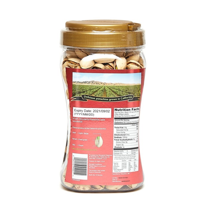 Wonderful, Pistachios, Sweet Chili (0014113913331) - Is it Vegan ... Nutrition Label As sold for 100 g / 100 ml As sold per serving (35 g (1.25 oz)) Serving Size: 35 g (1.25 oz) Energy: 1197 (kj) 419 (kj) Fat: 25.71 (g) 9 (g) Saturated Fat: 2.86 (g) 1 (g) Trans Fat: 0 (g) 0 (g) Cholesterol: 0 (mg) 0 (mg) Carbohydrates: 14.29 (g) 5 (g) Sugars: 5.71 (g) 2 (g) Fiber: 5.7 (g) 2 (g) Proteins: 11.43 (g) 4 (g) Salt: 1.306 (g) 0.457 (g) Sodium: 0.514 (g) 0.18 (g) Vitamin A The Wonderful Company :: Wonderful Pistachios Wonderful Pistachios help you lead a healthy, active lifestyle and provide nutrients—all while you enjoy a delectably satisfying snack. NUTRITIOUS AND HEALTHY Pistachios offer nutrients and minerals great for overall health. They are one of the highest-fiber snack nuts. Even better, Wonderful Pistachios are Non-GMO Project Verified. SMART SNACKING