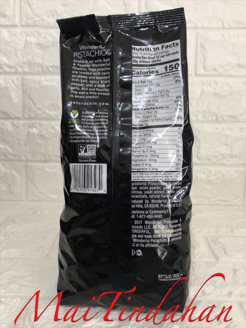 Wonderful Pistachios, Salt and Pepper Flavored, Bag, Salt & Pepper ... CALIFORNIA GROWN: Wonderful Pistachios owns, cultivates and harvests more than 75,000 acres of pistachio and almond California orchards, where we carefully tend and harvest using the latest sustainable practices. ... Pistachios offer nutrients and minerals great for overall health. Not only are they a good source of fiber, 90% of the fat found ... Wonderful Pistachios - FBK - Pistachios, honey roasted & salted per ... Find calories, carbs, and nutritional contents for Wonderful Pistachios - FBK - Pistachios, honey roasted & salted per label incl potassium and over 2,000,000 other foods at MyFitnessPal ... Wonderful Pistachios Wonderful Pistachios - FBK - Pistachios, honey roasted & salted per label incl potassium. Serving Size : 28 grams edible portion. 170 ... Wonderful Pistachios - Pistachios, roasted & salted per label incl ... Find calories, carbs, and nutritional contents for Wonderful Pistachios - Pistachios, roasted & salted per label incl potassium and over 2,000,000 other foods at MyFitnessPal ... Wonderful Pistachios Wonderful Pistachios - Pistachios, roasted & salted per label incl potassium. Serving Size : 50 grams edible portion. 290 Cal. 18 % 14g Carbs. 67 ... Wonderful Pistachios Macro Nutrition Facts [Food Label Data] Nutritional information for Wonderful Pistachios. Per 1/2 cup with shells (28g): 150 Calories | 13g Fat | 8g Carbohydrates | 3g Fiber | 2g Sugar | 6g Protein | 135mg Sodium | 0mg Cholesterol | 280mg Potassium.