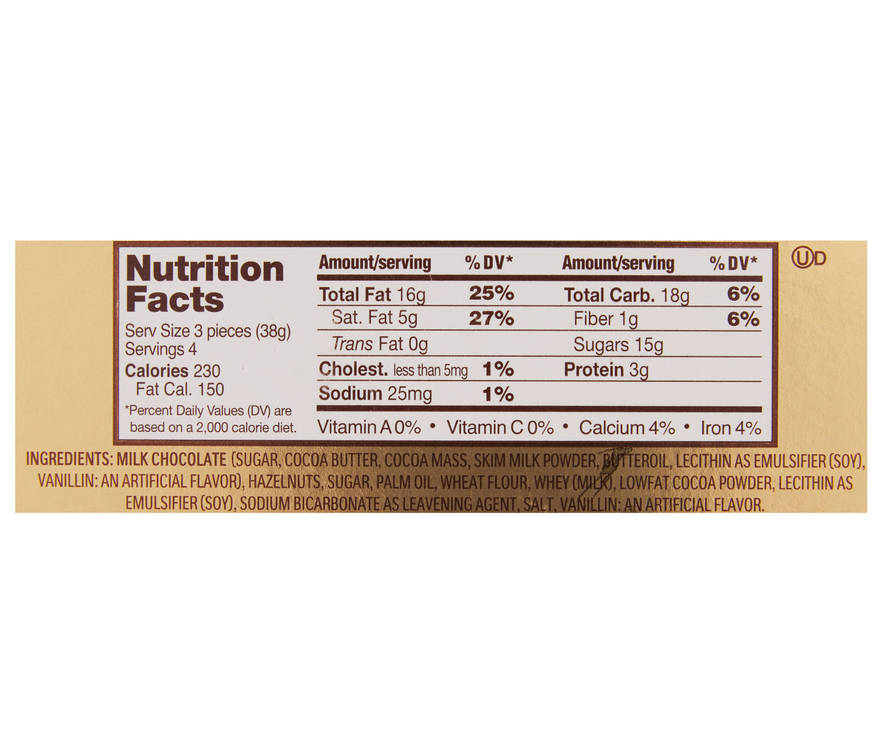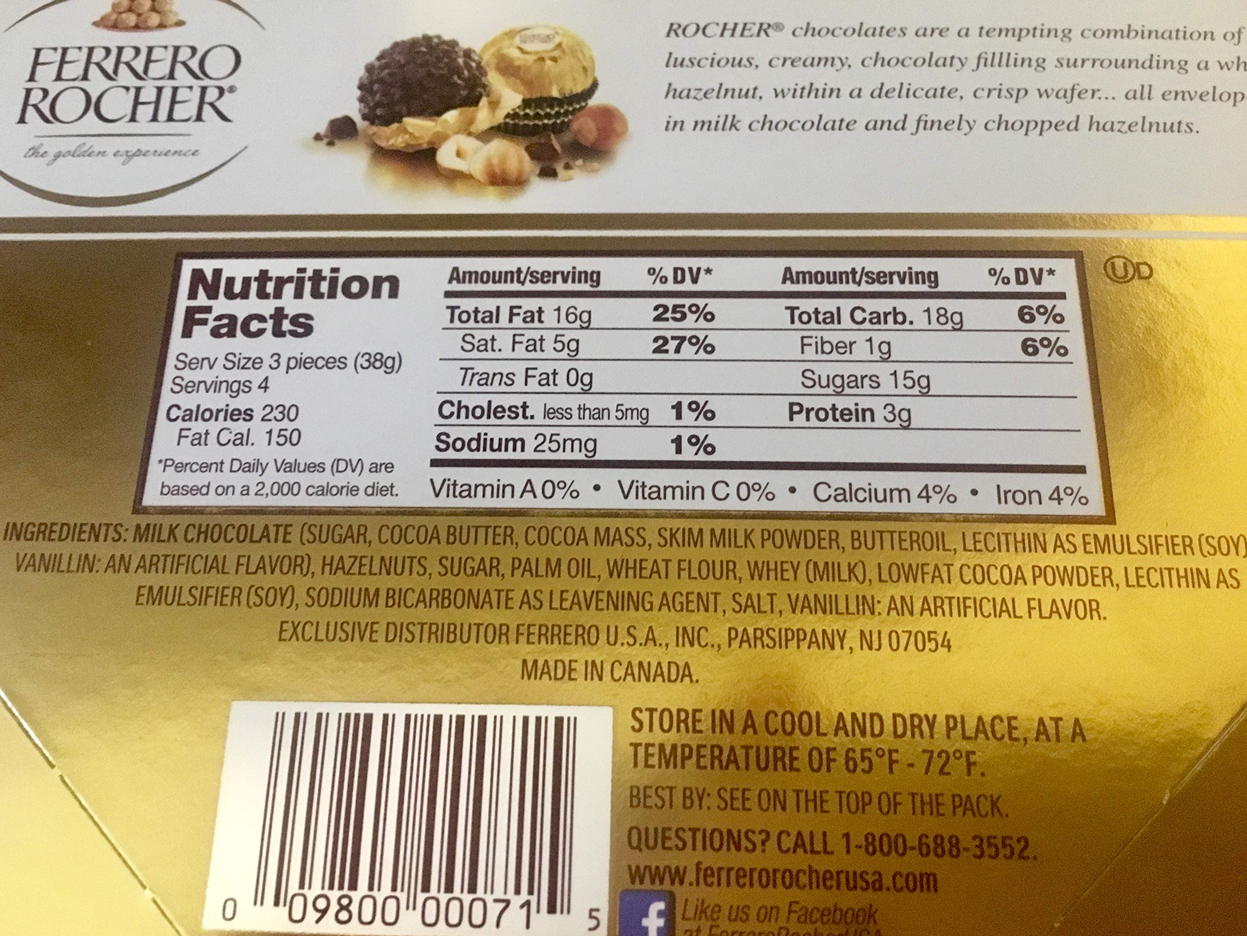 Is Nutella In Ferrero Rocher? - Get Eatin' There actually is a thin layer of Nutella in Ferrero Rocher. Ferrero Rocher was released almost three decades after Nutella was first produced so it was easy to add it in. However, a few years later production was stopped due to an issue with printing the labels. Ferrero Rocher Nutrition Label Ferrero Rocher Nutrition Facts - shards.info Ferrero Rocher Nutrition Label Ferrero Rocher Nutrition Facts, Nutrition Month Poster Healthy Diet, Calories Ham And Egg Hash Brown Casserole, Islands That Are Dependent Territories Mediterranean Diet, Nutrition Information Collard Greens, Exercise Chart Burning Calories, Positives Of Raw Food Diet Calories in Ferrero Rocher - Calorie, Fat, Carb, Fiber ... - SparkPeople Calories in Ferrero Rocher based on the calories, fat, protein, carbs and other nutrition information submitted for Ferrero Rocher. main content Live Healthy & Happy