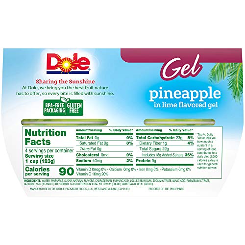 Dole pineapple fruit cups nutrition facts. › Dole-Fruit-Bowls-GrapefruitAmazon.com : Dole Fruit Bowls Red Grapefruit Sunrise in 100% ... Dole Pineapple Paradise Pineapple Tidbits in a Blend of 100% Fruit Juices, Gluten Free Healthy Snack, 4 Oz Fruit Bowls, 12 Total Cups 4.7 out of 5 stars 2,743 1 offer from $7.99 › ip › 4-Cups-Dole-Pineapple-TidbitsDole Fruit Bowls Pineapple Tidbits in 100% Fruit Juice, 4 oz ... Enjoy the refreshing taste of hand-selected pineapple in 100% fruit juice! Now you can easily enjoy more fruit and sunshine every day in a convenient fruit in a cup. DOLE FRUIT BOWLS Pineapple Tidbits in 100% Fruit Juice are made from the best sun-ripened fresh fruit that nature has to offer, and are non-GMO and gluten free. › pineapple-nutrition-factsPineapple Nutrition Facts and Health Benefits - Verywell Fit Sep 15, 2022 · Pineapple Nutrition Facts . One cup of pineapple chunks (165g) provides 82 calories, 0.9g of protein, 22g of carbohydrates, and 0.2g of fat. Pineapple is an excellent source of vitamin C. The following nutrition information is provided by the USDA. › ip › Dole-100-Pineapple-Juice-AllDole 100% Pineapple Juice, All Natural Canned Pineapple Juice ... With Dole's shelf-stable products, you can have the delicious taste of refreshing fruit flavors anywhere, anytime. Enjoy the taste of delicious pineapples with Dole 100% Pineapple Juice! About Dole: Dole Packaged Foods, LLC, is a world leader in growing, sourcing, distributing and marketing fruit and healthy snacks.