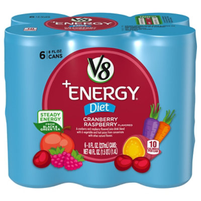 Diet Strawberry Lemonade - V8® Fruit and Vegetable Juices V8 +ENERGY ® gives you the steady energy you need to be at your best during your busy day. A delicious energy juice drink powered by natural black & green tea giving you 80 mg of caffeine (about the same as a cup of coffee). V8 +ENERGY ® Diet Strawberry Lemonade is an excellent source of B vitamins and has only 10 calories per can.
