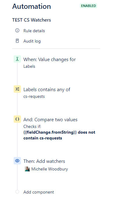 Organize your rules with labels | Automation for Jira Data ... 21 Jun 2022 — Labels are key words or tags that you can add to rules and use them to categorize, identify or bookmark content in Automation for Jira. Automation for Jira: Trigger if certain label was added. How? 22 Jul 2020 — Automation for Jira: Trigger if certain label was added. How? ... I am struggling with a case, where I would like an automation rule to trigger if ...