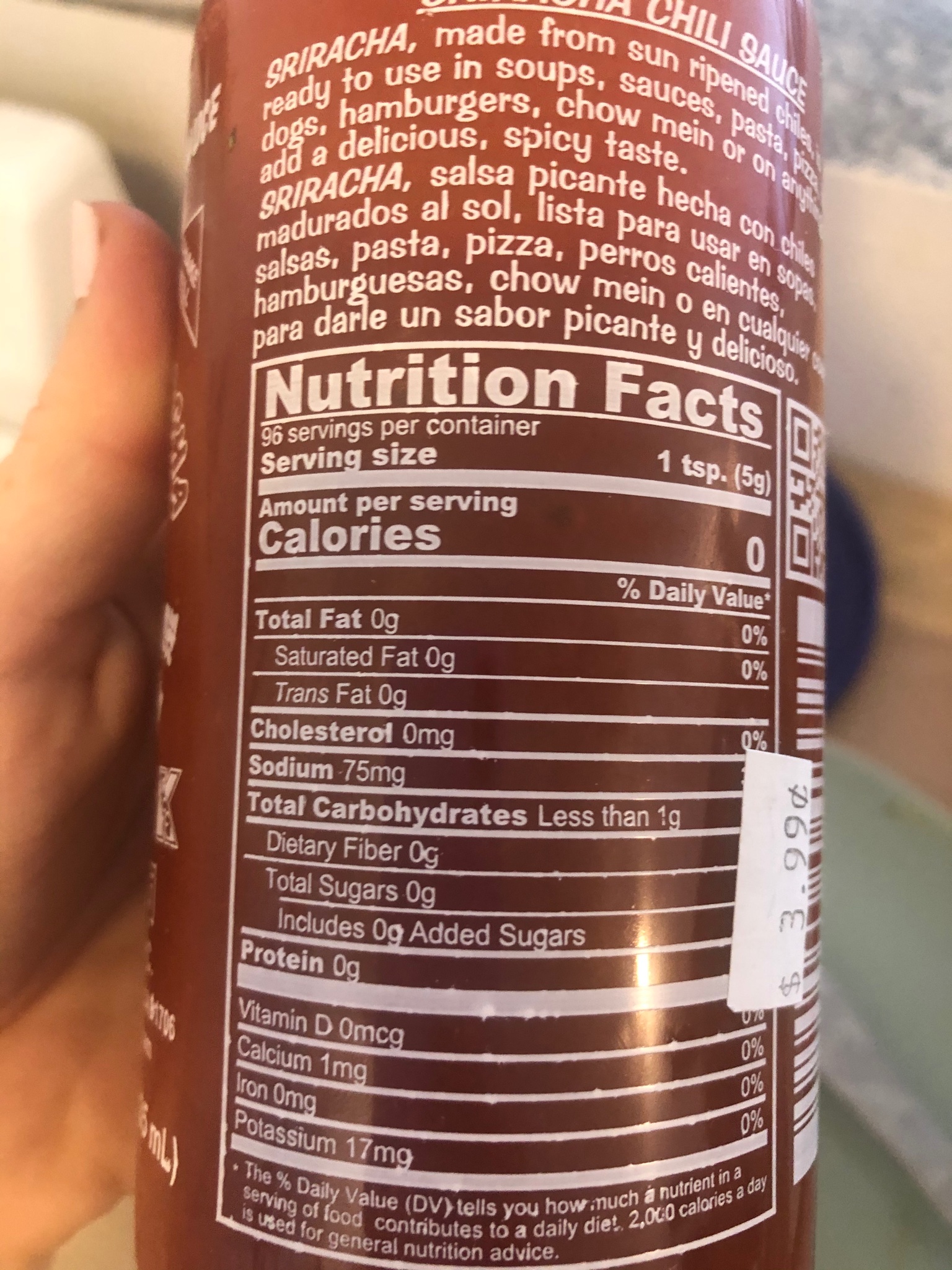 Huy Fong Sriracha Chili Hot Sauce, 28 oz Bottle (Pack of 2) (1 Pack) Amazon.com : Huy Fong Sriracha Chili Hot Sauce, 28 oz Bottle (Pack of 2) (1 Pack) : Grocery & Gourmet Food ... 2.0 out of 5 stars Nutrition Label is Highly Deceptive, Re: Sugar Reviewed in the United States on April 14, 2019 Based on the serving size they chose, they are able to round down and proclaim proudly on the side or the bottle ... Sriracha Sauce Nutrition Label - This Nutrition Published on: 21/11/2020 | Last Updated: 07/04/2021. Learn more information about sriracha sauce nutrition label. Sriracha Is Way More Unhealthy Than You Realized - Elite Daily After chili, sugar and salt are the most prevalent ingredients in this sauce. In fact, Sriracha contains about 1 gram of sugar and 100 milligrams of sodium per teaspoon. To put that into... Amazon.com : Huy Fong Sriracha Hot Chili Sauce, spice,chili,sriracha … Amazon.com : Huy Fong Sriracha Hot Chili Sauce, spice,chili,sriracha 9 Ounce (Pack of 3) : Grocery & Gourmet Food ... 2.0 out of 5 stars Nutrition Label is Highly Deceptive, Re: Sugar Reviewed in the United States on April 14, 2019 Based on the serving size they chose, they are able to round down and proclaim proudly on the side or the bottle ...