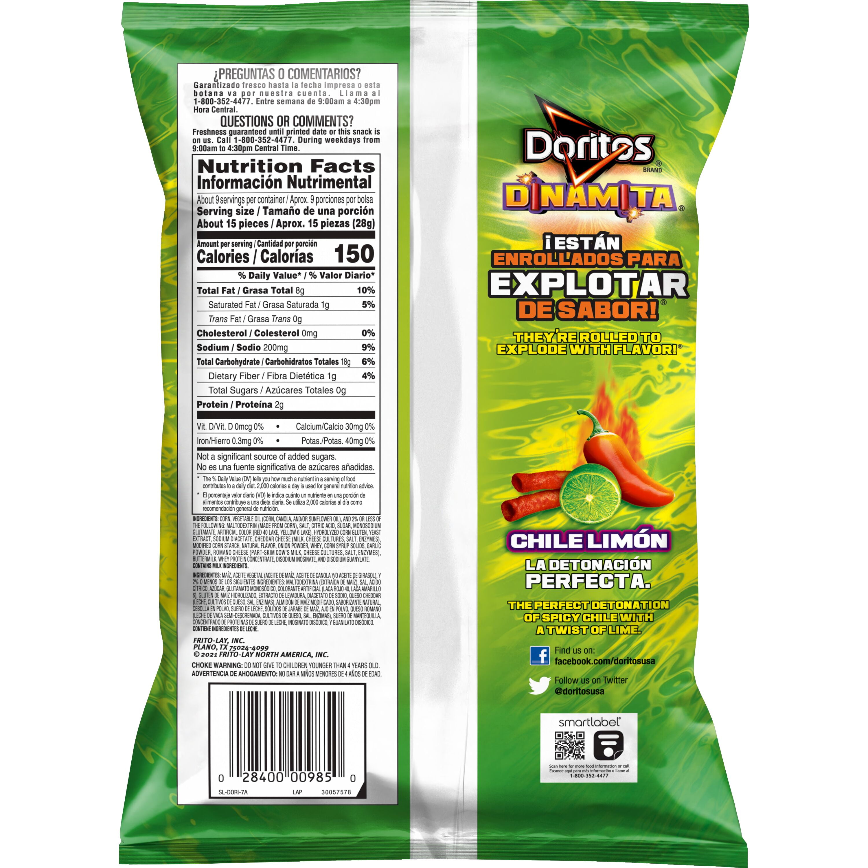 DORITOS® DINAMITA® Chile Limón Flavored Rolled Tortilla Chips However, we recommend that you check the label on a specific product for the most current and accurate nutritional information. If you need assistance, please contact Consumer Relations toll-free at 1-800-352-4477 Monday through Friday between 9:00 a.m. and 4:30 p.m. Central Standard Time. ... Buy Now DORITOS® DINAMITA® Chile Limón Flavored ...