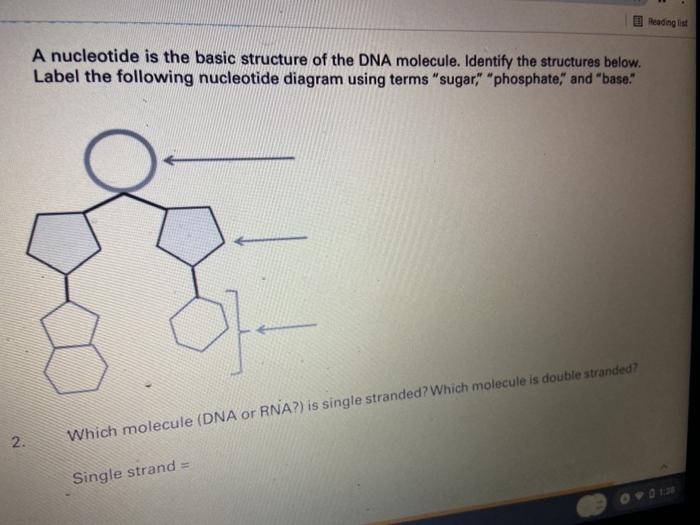 The Structure of DNA - University of Arizona Each nucleotide is itself make of three subunits: A five carbon sugar called deoxyribose (Labeled S) A phosphate group (a phosphorous atom surrounded by four oxygen atoms.) (Labeled P) And one of four nitrogen-containing molecules called nucleotides . (Labeled A, T, C, or G) DNA Structure - Visible Body A molecule of DNA has two strands, composed of nucleotides, that form a double helix shape. 2. Each DNA strand is composed of nucleotides—units made up of a sugar (deoxyribose), a phosphate group, and a nitrogenous base. Each strand of DNA is a polynucleotide composed of units called nucleotides. A nucleotide has three components: a sugar ... Nucleotide labeled structure Diagram | Quizlet Nucleotide labeled structure Diagram | Quizlet Nucleotide labeled structure + − Learn Test Match Created by alainamaee PLUS Terms in this set (6) Phosphate ... Sugar ... Purine ... Guanine ... Pyrimidine ... Cytosine ... Sets found in the same folder meiosis vocab 29 terms emilymayying biology chapter 1 assesment 35 terms alainamaee PLUS Nucleotide - Wikipedia Nucleotides are composed of three subunit molecules: a nucleobase, a five-carbon sugar ( ribose or deoxyribose ), and a phosphate group consisting of one to three phosphates. The four nucleobases in DNA are guanine, adenine, cytosine and thymine; in RNA, uracil is used in place of thymine.